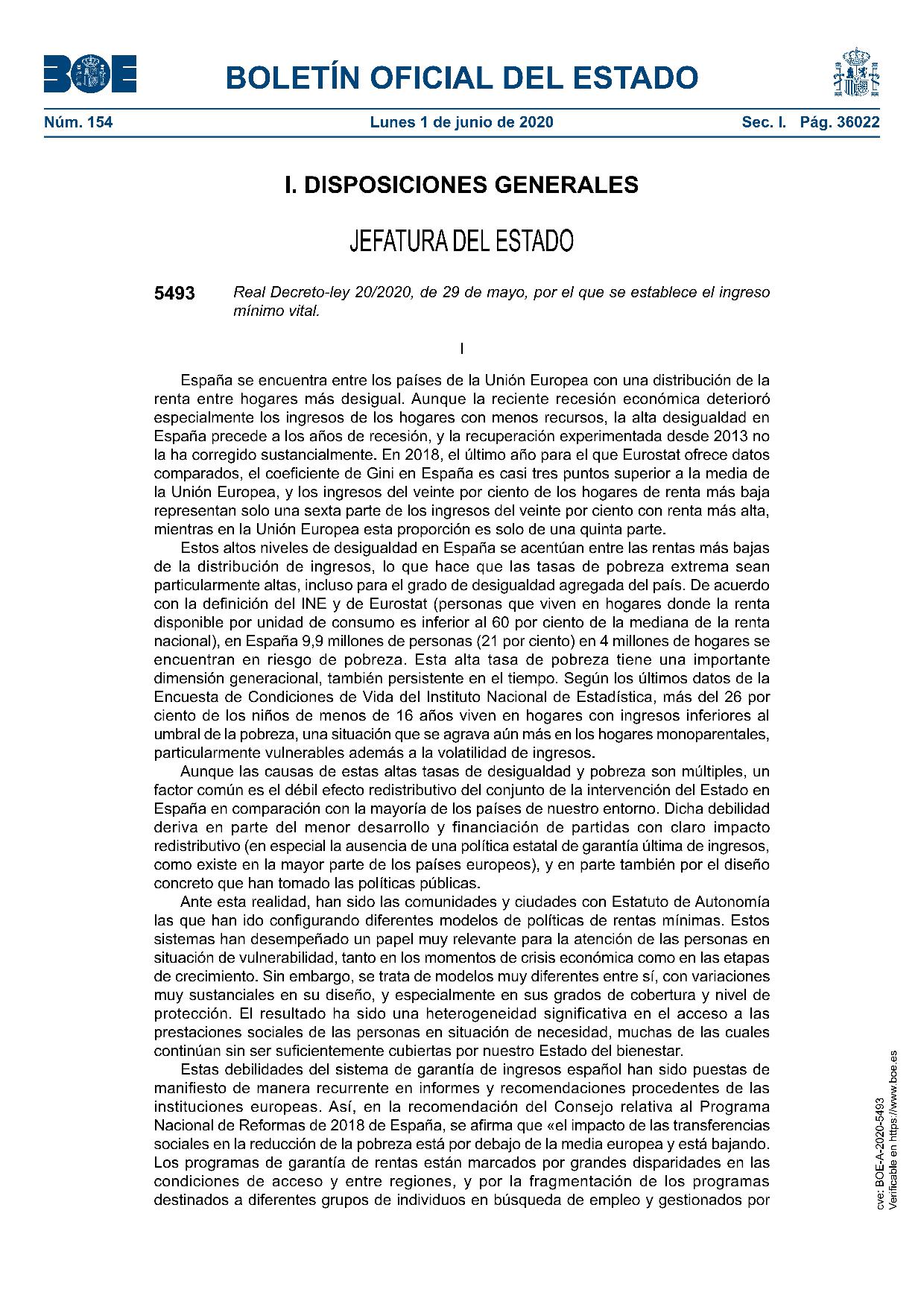 Real Decreto-ley 20/2020, de 29 de mayo, por el que se establece el ingreso mínimo vital.