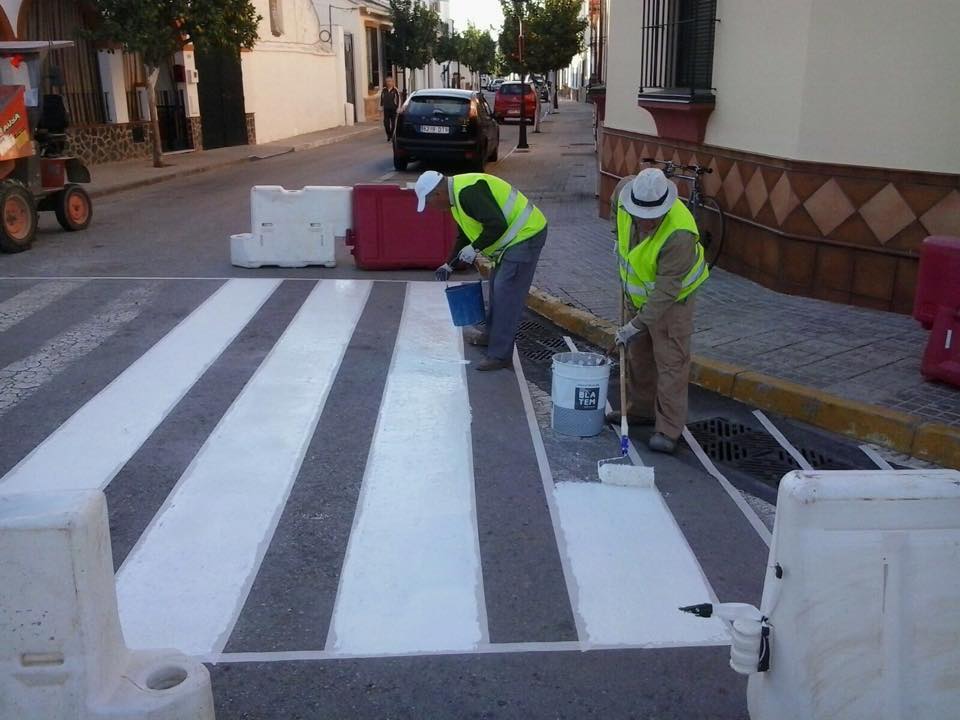 Continúan desarrollándose tareas de mantenimiento en las vías públicas. El personal de Obras y Servicios del Ayuntamiento de Umbrete, para mejorar la señalización de marcas viales del municipio, en este caso la señalización horizontal, está pintando los pasos de peatones alrededor de la rotonda en la que confluyen las calles San Bartolomé, La Carrera, Androna, Camino de Sanlúcar y Alcalde Francisco Salado.