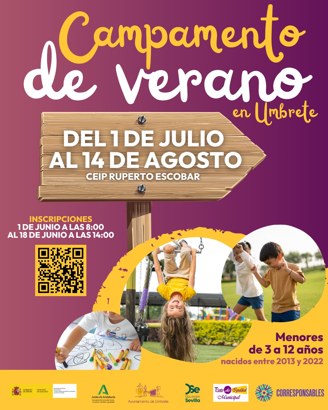 El Ayuntamiento de Umbrete organiza el Campamento de Verano enmarcado en el Plan Corresponsables financiado por la Secretaría de Estado de Igualdad para la erradicación de la violencia contra las mujeres del Ministerio de Igualdad y la Consejería de Inclusión Social, Juventud, Familias e Igualdad, contando con la colaboración de la Diputación de Sevilla.