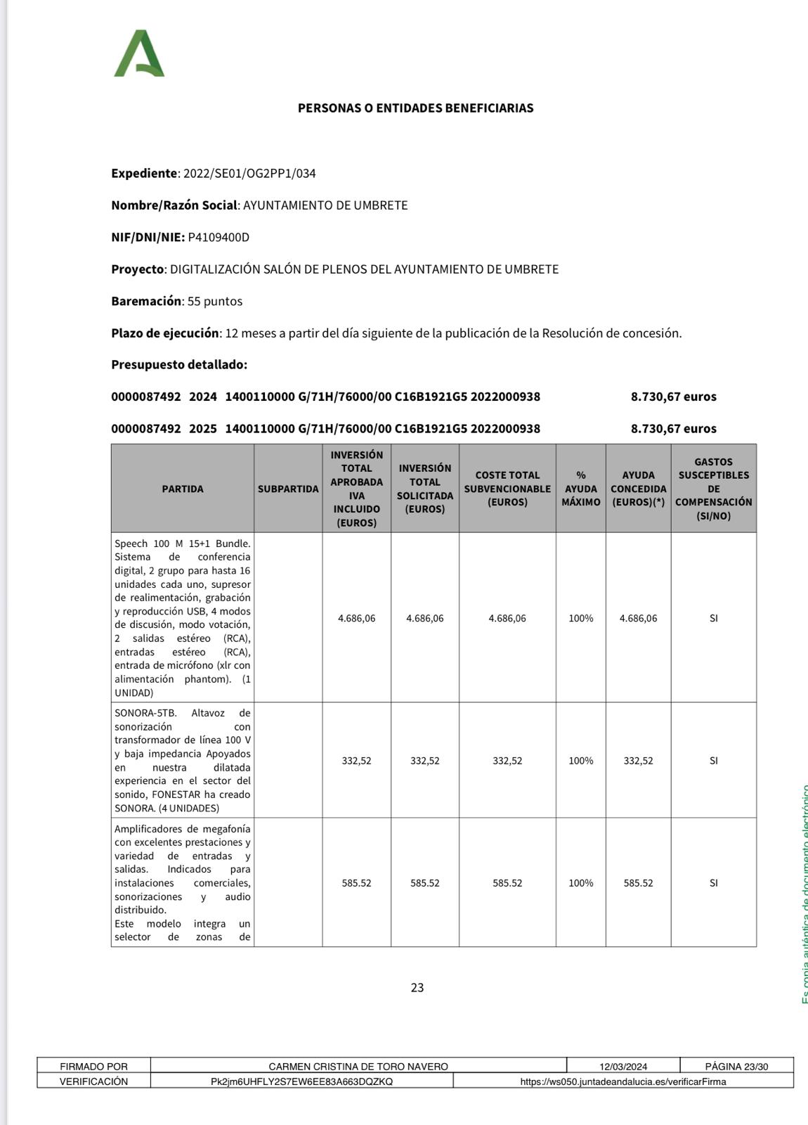 El Grupo de Desarrollo Rural Aljarafe-Doñana (ADAD) ha subvencionado con fondos del programa LEADER, que cofinancia el FEADER de la Unión Europea y la Consejería de Agricultura, Pesca, Agua y Desarrollo Rural, un proyecto del Ayuntamiento de Umbrete consistente en la digitalización del Salón de Plenos del Ayuntamiento, con un importe de 17.461,35€, tal y como se detalla en la documentación adjunta.