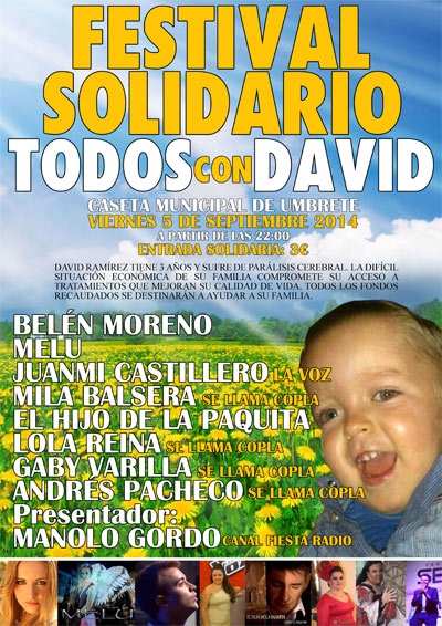El viernes 5 de septiembre, en Umbrete, Festival Solidario en apoyo de David, niño de 3 años con parálisis cerebral