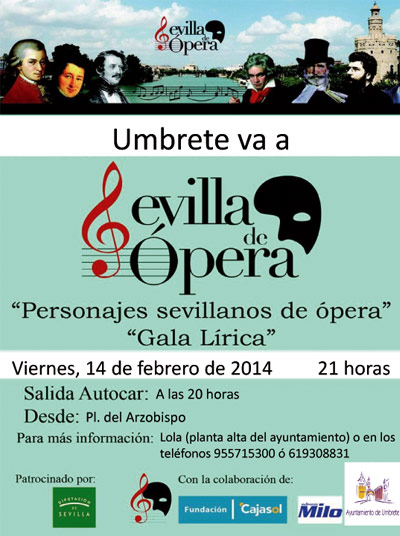 El Ayuntamiento de Umbrete, en colaboración con la colaboración de la Diputación de Sevilla y de la Fundación Cajasol pone en marcha una iniciativa que permitirá acercar la ópera a los vecinos y vecinas de Umbrete. Para el próximo 14 de febrero está previsto un viaje a Sevilla, para acudir a la representación de la ópera 'Personajes sevillanos de ópera. Gala lírica'. El viaje tiene un coste de tan solo 5 euros y se realizará el viernes 14 de febrero, partiendo el autobús desde la Plaza del Arzobispo a las 20:00.
