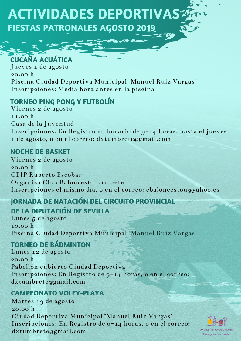 El Ayuntamiento de Umbrete ha organizado una amplia oferta de actividades deportivas que se celebrarán a lo largo del mes de agosto con motivo de las Fiestas Patronales de Umbrete 2019.