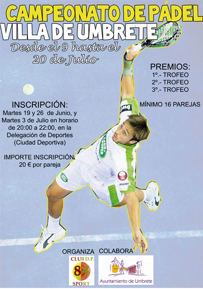 En nuestro pueblo tendrá lugar, organizado por el Club D.P. Sport 84 en colaboración con el Ayuntamiento de Umbrete, un Torneo de Pádel que culminará con una gran final prevista para el jueves 13 de julio, día en el que, a partir de las 21:00, tendrán lugar las finales de la 1ª categoría y de la categoría de consolación. El pasado miércoles tuvo lugar en el Ayuntamiento de Umbrete el sorteo del cuadro de emparejamientos del Torneo. En la imagen que acompaña esta noticia se puede ver los partidos previstos para la primera ronda del Campeonato así como los cruces en próximas rondas. Han sido muy numerosos los vecinos de nuestra localidad que se han inscrito en este torneo. Les deseamos a todos ellos la mejor de las suertes y que pasen momentos amenos practicando deporte.