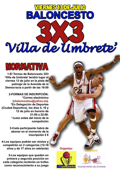 El próximo viernes 8 de julio se celebra en Umbrete el Torneo 3x3 de Baloncesto. El miércoles 6, en la Ciudad Deportiva, partido amistoso del Club Femenino El Arco