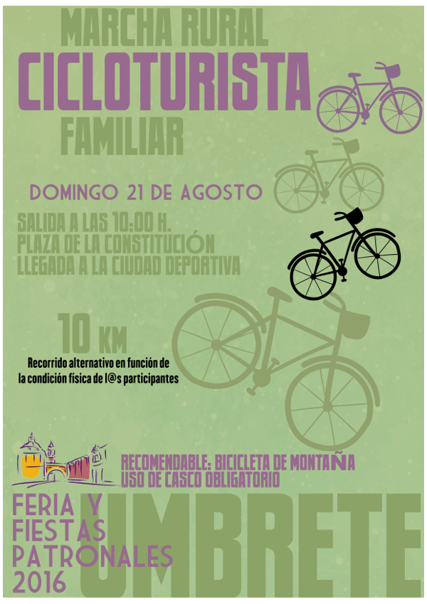 Parael próximo domingo 21 de agosto, la Delegación de Fiestas del Ayuntamiento de Umbrete ha organizado una Marcha Rural Cicloturista Familiar.