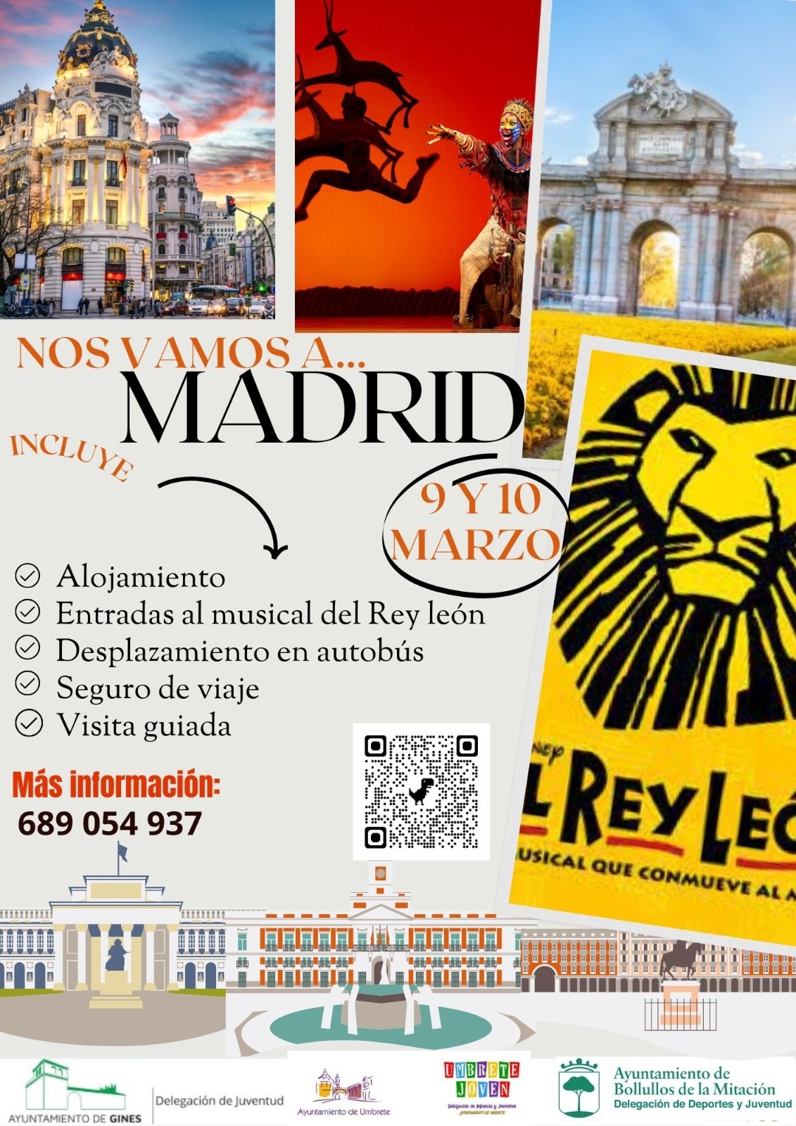 esde la delegación de Juventud del Ayuntamiento de Umbrete, de manera conjunta con los Ayuntamientos de Gines y de Bollullos de la Mitación, han planificado un viaje de ocio y cultural a Madrid dirigido a jóvenes de edades entre los 18 y 35 años.